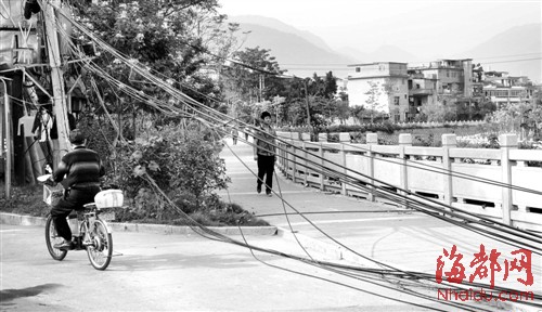 福州晋安区赤桥路旁 电杆拔走后电缆成“路障”