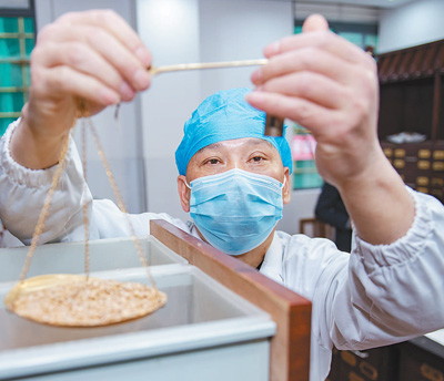 3月2日,福建省泉州市德化县医院的中药师在根据处方调配中药。 邵玉姿 许华森摄影报道