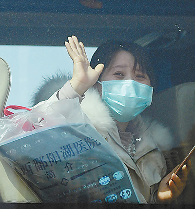 2月22日,江西中医药大学附属医院抚生院区,11名此前由其他医疗机构转入该院的新冠肺炎患者治愈出院,其中有8人在该院接受了中医治疗,3人接受中西医结合治疗。图为出院的病人向医护人员挥手告别。 时 雨摄(影像中国)