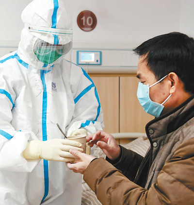 2月18日,在江西中医药大学附属医院抚生院区新冠肺炎患者的隔离病房内,护士将中药汤剂端给患者。 时 雨摄(影像中国)