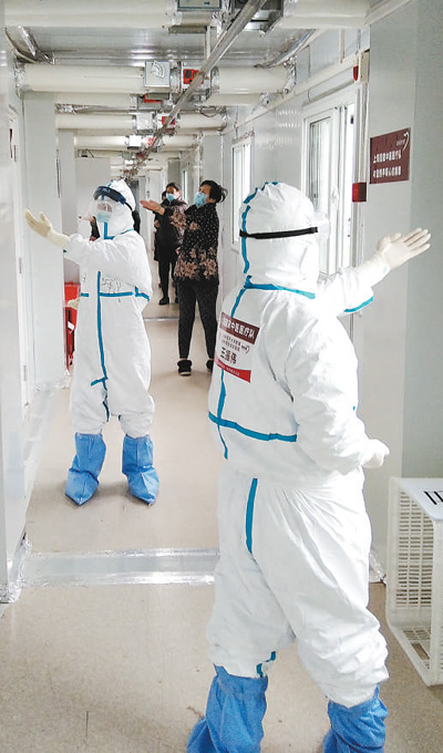 武汉雷神山医院,上海支援湖北医疗队的医护人员在教患者按照“六字诀”中医功法进行锻炼。 姜泓冰 龚亚斌摄影报道 版式设计:蔡华伟 |