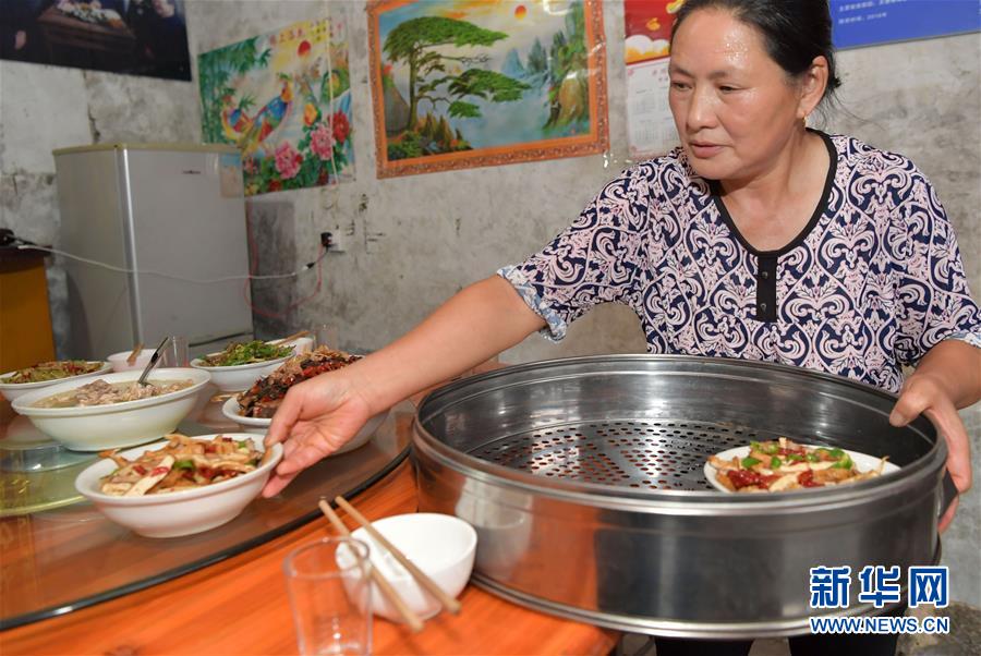 神山村村民彭夏英在自己开的农家乐给游客上菜(7月15日摄)。新华社记者 彭昭之 摄