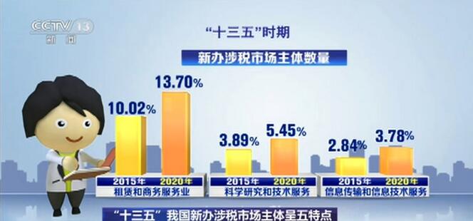 根据国家税务总局报告,“十三五”时期,我国租赁和商务服务业、科学研究和技术服务、信息传输和信息技术服务等现代服务业的新办涉税市场主体数量占比明显提高.
