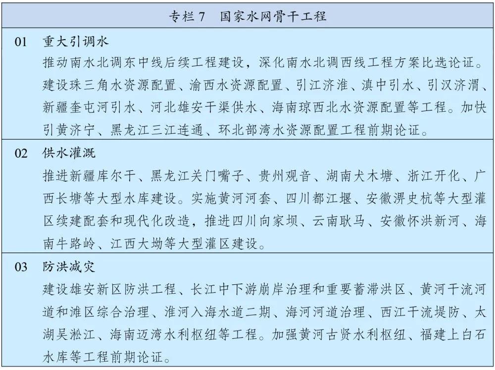 国家水网骨干工程 加强跨行政区河流水系治理保护和骨干工程建设,强化大中小微水利设施协调配套。 加强重点水源和城市应急备用水源工程建设。 实施防洪提升工程,全面推进堤防和蓄滞洪区建设。