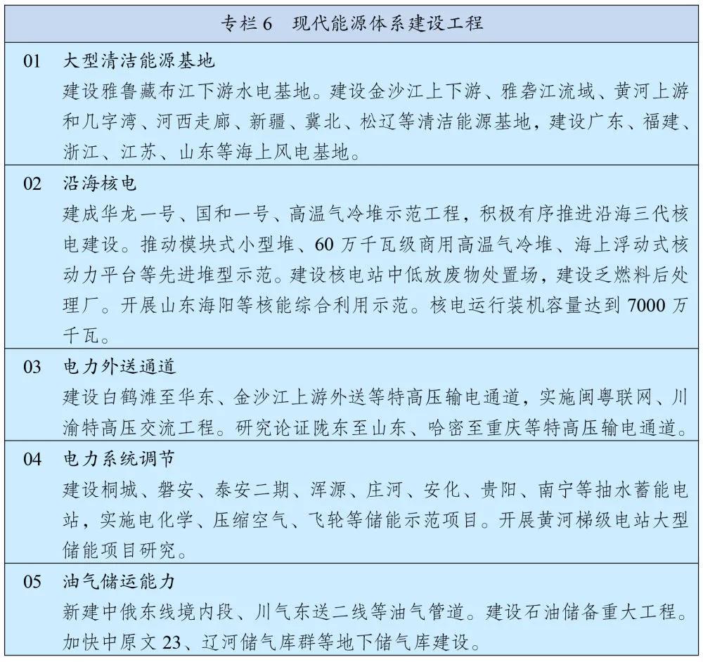 现代能源体系建设工程 有序发展海上风电,加快西南水电基地建设,安全稳妥推动沿海核电建设。 建设一批多能互补的清洁能源基地,非化石能源占能源消费总量比重提高到20%左右。