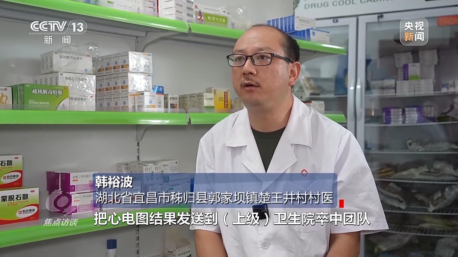 湖北省宜昌市秭归县郭家坝镇楚王井村村医 韩裕波:我带上卫健局配送的心电图机赶到谭大伯家,第一时间给他做了心电图,把结果发送到上级卫生院卒中团队,分析是心肌梗塞,在指导下,我给他采用了突击疗法,上急救性‘一包药’,呼叫120,等待他们来救援。 秭归县境内山峦起伏,长江由西向东将县城分为南北两部分,12个乡镇散落其间。谭大伯所在的楚王井村,距最近的郭家坝镇中心卫生院有近30公里的山路,往返需要近3个小时。但如果乘快艇走长江水路,只需要30分钟。危急时刻,120联系归州海事处派来的快艇,仅用了10分钟就赶到现场,通过水路将病人及时送到了乡镇医院。