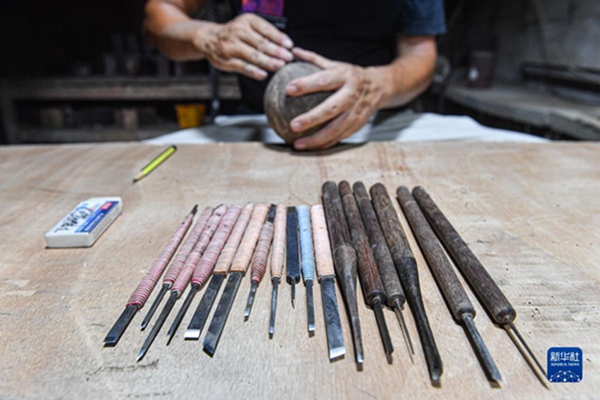 这是在柯秋枫位于海口琼山区儒传村的工作室里拍摄的椰雕刻刀(9月14日摄)。 海南椰雕是以椰壳、椰木和椰棕为原料的一种传统雕刻艺术,2008年被列入国家级非物质文化遗产名录。 “从我第一眼看到椰雕就喜欢上了这门技艺。”51岁的海南椰雕省级代表性传承人柯秋枫说。他于1994年进入原海口椰雕工艺厂工作,跟工艺厂的师傅学艺十年后,他开始独自从事椰雕工艺品制作。 柯秋枫介绍,椰雕除可制作装饰画、花瓶和摆件等艺术品外,还可制作碗、瓢、纸巾盒、茶叶罐等诸多生活用品。一件椰雕制品通常需要经过设计、选材、打磨、开料、雕镂、镶嵌和上漆等工序制作而成。 左手按住椰壳,右手紧握刻刀,一厘米一厘米地在坚硬又有弧度的椰壳表面刻出纹理。这是柯秋枫在进行椰雕创作时最常见的动作。他表示,椰雕雕刻必须全神贯注,稍有不慎刻刀就会跑偏划破手掌或胳膊。从事椰雕20多年,他的手掌、胳膊都留下了不少伤痕。 除自己制作椰雕外,柯秋枫还每周为海南职业技术学院的学生讲授椰雕技艺,让椰雕这门传统技艺不断传承。 新华社记者 蒲晓旭 摄 |