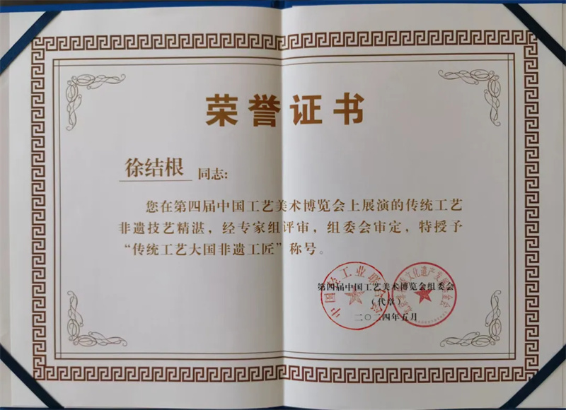 2024年5月12日,正高级工艺美术师、广东省工艺美术大师徐结根先生荣获第四届中国工艺美术博览会“百鹤金鼎奖”与“传统工艺大国非遗工匠”荣誉称号。