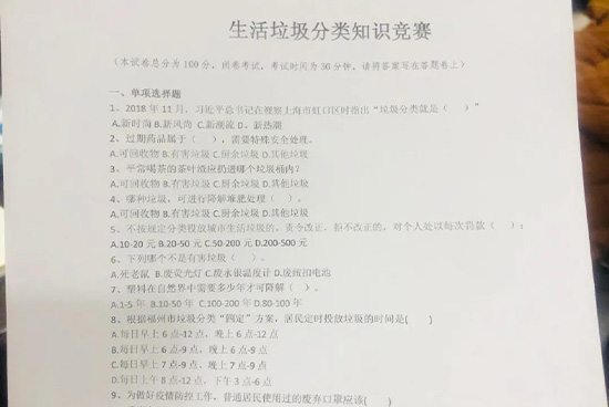 现场主持人还为全体教职工带来了“垃圾分类”试卷,设置了垃圾分类知识题目。让全体每个教职工都能亲身静下心来,认真作答,同时增长垃圾分类知识。 四、颁奖