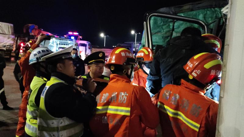 事故现场,小货车与半挂车追尾致后车车头凹陷,严重损毁变形,驾驶员被困车内,情况危急。古田中队与现场高速交警、勤务站做好安全防护措施,一组人员加大事故现场警示范围,高速执法员协助交警进行路面疏导,指挥后方车辆,为120急救车辆打开应急车道;另一组人员配合消防救援部门开展救援,对驾驶员进行安抚、调动驾驶员情绪。消防员争分夺秒地对变形的驾驶室进行破拆。随后,救护人员在一旁支好担架床,转移伤员。经过紧张救援,2月29日00时17分驾驶员被成功救出,并送往当地医院进行救治。