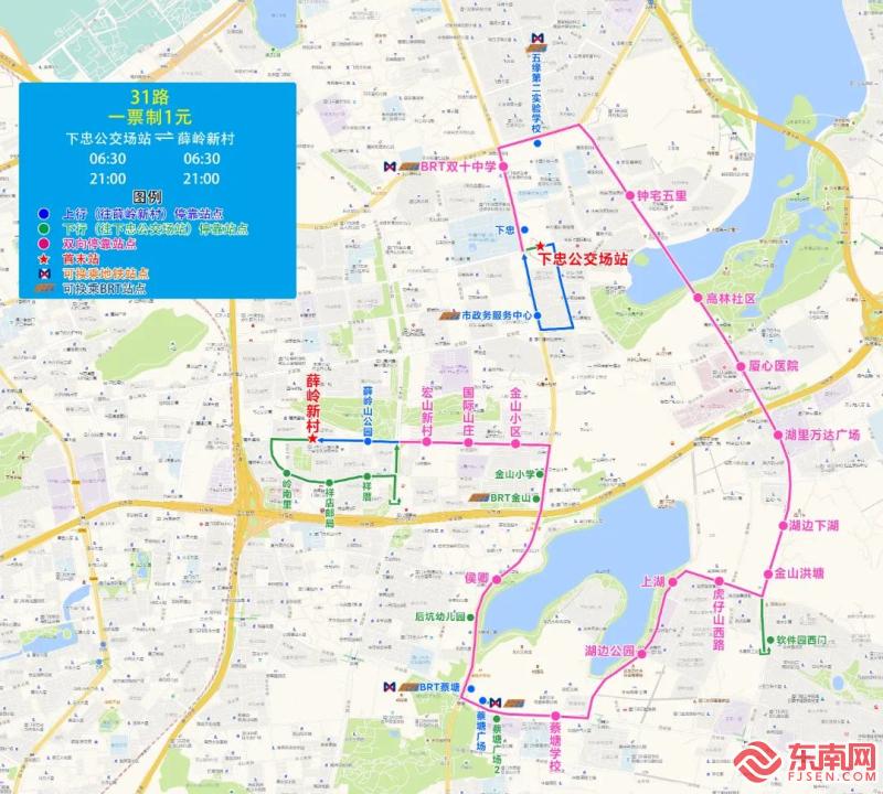31路公交线路图(厦门运输中心供图) 1.31路:结合湖里区下忠安置房项目配套建设的下忠公交场站启用,31路将从翰林苑西门改至下忠公交场站始发,方便厦忠玺悦小区乘客出行。调整后的线路长度为13.7公里,首末班时间分别为下忠公交场站6:30-21:00,薛岭新村6:30-21:00。