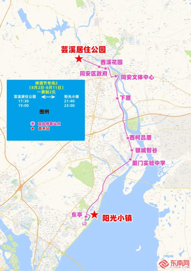 啤酒节专线2公交线路图(厦门运输中心供图) 2、啤酒节专线2(芸溪居住公园 - 阳光小镇) 线路走向:上行从芸溪居住公园始发,经银湖西路、银湖中路、银湖路、环城南路、滨海西大道(滨海西大道观涛路口调头)、观波路至阳光小镇公交场站;下行从阳光小镇公交场站始发,经观波路、观滨路、观涛路、滨海西大道、环城南路、银湖路、银湖中路、银湖西路至芸溪居住公园。 停靠站点:芸溪居住公园、西溪花园、同安区政府、同安文体中心、下厝、西柯吕厝、银城智谷、厦门实验中学、东亭(上下行均为东侧站点)、阳光小镇。 线路长度:21公里。 发班时间:芸溪居住公园为17:30、18:00、18:15、18:30、18:45、19:00;阳光小镇首班为21:40,末班为23:00(发车间隔15分钟)。 票价:一票制2元。 |
