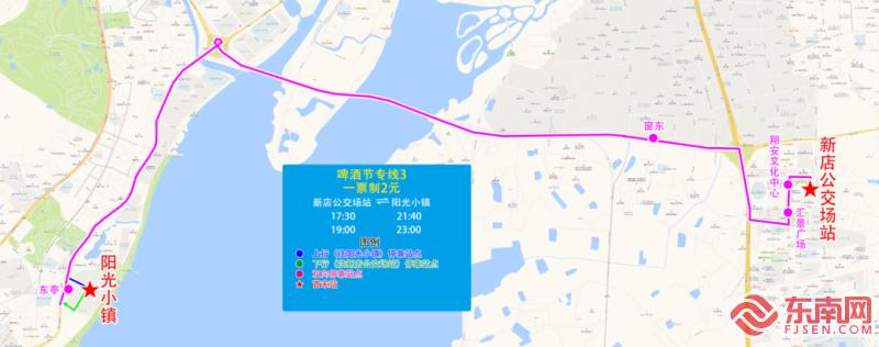 啤酒节专线3公交线路图(厦门运输中心供图) 3、啤酒节专线3(新店公交场站 - 阳光小镇) 线路走向:上行从新店公交场站始发,经曾吴路、新兴路、祥福路、翔安大道、海翔大道、滨海西大道(滨海西大道观涛路口调头)、观波路至阳光小镇;下行从阳光小镇始发,经观波路、观滨路、观涛路、滨海西大道、海翔大道、翔安大道、祥福路、新兴路、曾吴路至新店公交场站。 停靠站点:新店公交场站、翔安文化中心、汇景广场、窗东、东亭(上下行均为东侧站点)、阳光小镇。 线路长度:18公里。 发班时间:新店公交场站为17:30、18:00、18:15、18:30、18:45、19:00;阳光小镇首班为21:40,末班为23:00(发车间隔15分钟)。 票价:一票制2元。 |