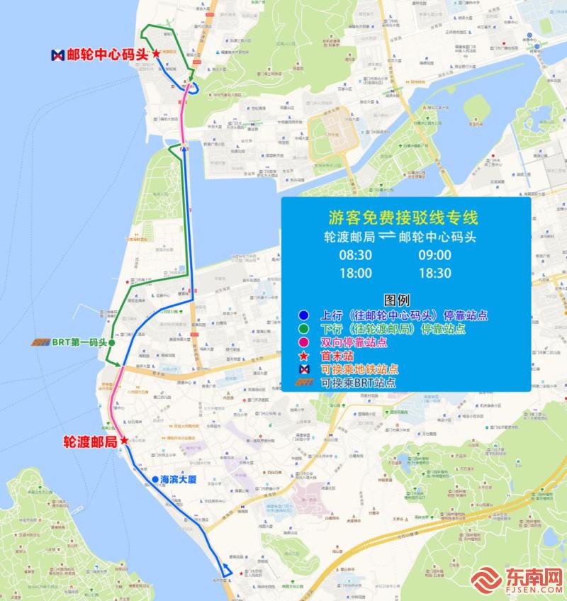 游客免费接驳专线公交线路图(厦门运输中心供图) 东南网8月1日讯(记者 刘玮 通讯员 江安娜)近日,为便利来厦游客往返邮轮中心码头与轮渡码头,连接鼓浪屿、中山路等核心景区,厦门公交集团开通了游客免费接驳专线。该专线运行线路走向取最短路径,停靠BRT第一码头与海滨大厦,方便游客通达码头前往鼓浪屿或漫步中山路。 具体线路方案为:上行从轮渡邮局始发,经鹭江道、寿山路、民族路、鹭江道、湖滨西路、东渡路、狐尾山隧道、东港路至邮轮中心码头;下行从邮轮中心码头始发,经东港路、东港北路、东渡路、湖滨西路、西堤东路、西堤南路、西堤路、厦禾路、鹭江道至轮渡邮局。停靠站点包括轮渡邮局、邮轮中心码头、BRT第一码头(往轮渡邮局方向)、海滨大厦(往邮轮中心码头方向)。线路长度为5.4公里,发班间隔15分钟一班,周末、节假日根据客流情况加密班次。首末班时间为轮渡邮局首班8:30,末班18:00;邮轮中心码头首班9:00,末班18:30。试运营期间免费。 |