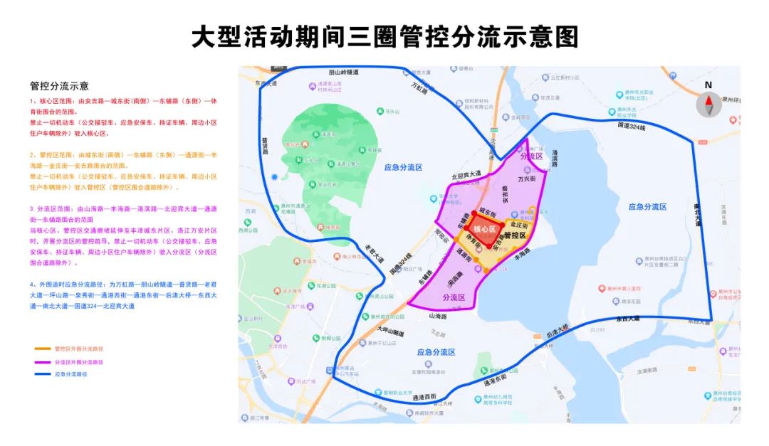 关于泉州市海峡体育中心大型活动期间实施交通管制的通告 2023年12月30日,泉州市海峡体育中心将举办大型活动,周边路段预计将迎来大量人流。为确保道路交通安全有序,根据《中华人民共和国道路交通安全法》第三十九条之规定,交警部门将对部分路段实行交通管制,具体通告如下: 一、交通管制时间 12月30日17:00至疏散完毕 二、交通管制措施 1、核心区 范围:安吉路—城东街(南侧)—东辅路(东侧)—体育街围合的范围。 管制措施:禁止一切机动车【公交接驳车、应急车辆、安保车辆、持证车辆(含周边小区住户车辆)除外】进入管控范围内,禁止一切机动车辆在管控路段内临时停放。 2、管控区 范围:城东街(南侧)—东辅路(东侧)—通源街—丰海路—金庄街—安吉路围合的范围。 管制措施:禁止一切机动车【公交接驳车、应急车辆、安保车辆、持证车辆(含周边小区住户车辆)除外】进入管控范围内(围合道路除外),禁止一切机动车辆在管控路段内临时停放,指挥引导管控区内一切车辆往外围绕行。 3、分流区 范围:由山海路—丰海路—洛滨路—北迎宾大道—通源街—东辅路围合范围。 管制措施:当城东片区、万安片区出现拥堵,启动分流区分流措施。开展分流区的管控疏导,禁止一切机动车【公交接驳车、应急车辆、安保车辆、持证车辆(含周边小区住户车辆)除外】进入分流区(分流区围合道路除外),指挥核心、管控区内一切车辆往外围(洛江、台商、惠安、鲤城、晋江、丰泽东海、城东北峰快速通道)绕行。 4、应急分流区 范围:万虹路—朋山岭隧道—普贤路—老君大道—坪山路—泉秀路—通港西街—通港东街—后渚大桥—东西大道—南北大道—国道324—北迎宾大道 管制措施:当分流区发生严重拥堵,立即开展外围分流路径疏导工作。