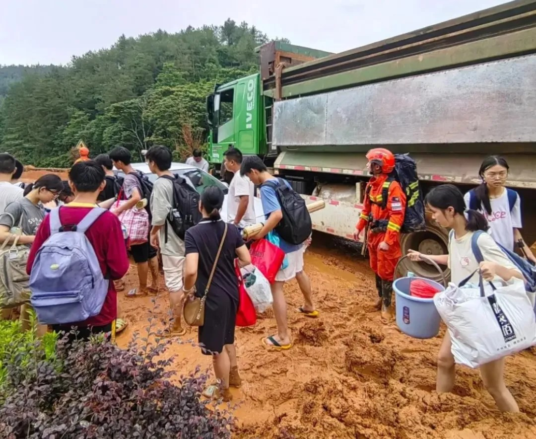 龙岩武平县中考生步行至万营村途中。 细致排查 除患避险 此次汛情来势猛、强度大,各地交警以雨为令、闻“汛”即动,增派警力部署到路面一线,强化隐患排查和路面疏控,持续加大巡逻救险力度,确保交通安全、社会有序,推动隐患动态清零。 6月16日,205国道朋口路段被滑落的泥石与树木所堵。龙岩市连城县公安局新泉派出所、交警大队连南中队第一时间赶往现场,设置警戒线、摆放警示标志,劝离滞留车辆和人员,确保过往车辆和人员平安出行;同时联系连南蓝天救援队开展清理落石、泥沙、树枝等,通过近3小时的努力,道路障碍物被清理完毕,道路恢复通行。