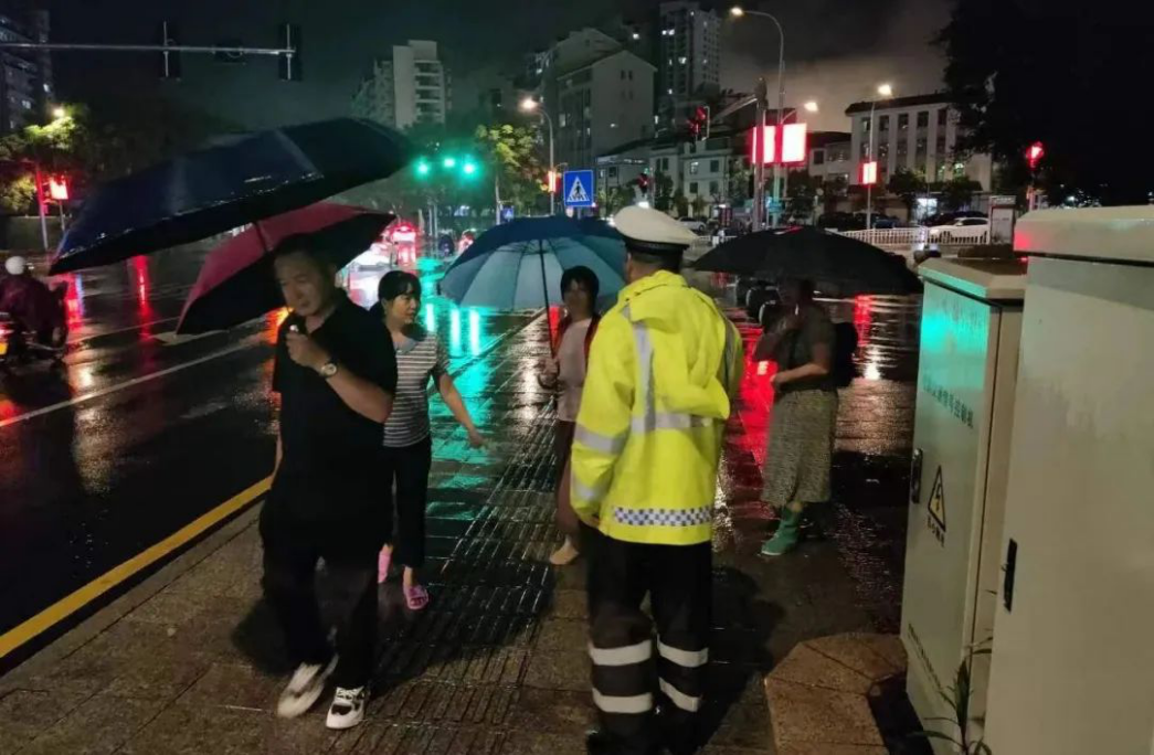 泉州市交警帮助抛锚车辆转移至安全区域。 宁德福安市交警大队及时启动恶劣天气应急预案,根据辖区实际,科学布警,全警动员,切实加强辖区重点路口、路段的交通安全管理工作,提醒过往驾驶人“降速、控距、亮尾”,防止汛期意外交通事故。