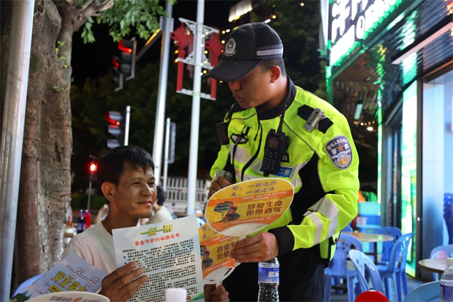 漳州交警供图 7月6日至7日,龙岩交警开展集中统一行动,深入城区主要路段、夜市、酒店、大排档等重点场所,抓好安全宣传教育,助力文明交通,充分发挥交通安全宣传提示的积极作用,以“生命无价、酒后禁驾”为主题,全方位开展社会面宣传警示教育。