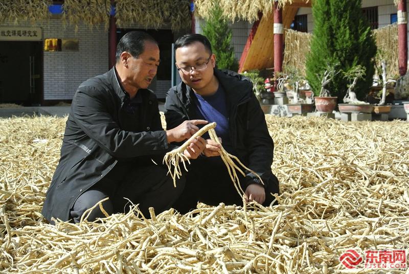 高健(右一)和爷爷高代元在满院子都是纹党参前交流探讨今年收成纹党的品质。东南网记者 林先昌 摄 东南网10月27日甘肃电(本网记者 林先昌)分拣、上串、晾晒、搓揉……在文县中寨纹党产区代元有限公司的大院子里,数十个工人正忙碌着将成堆的纹党参进行冲洗。 三年前,高健从南开大学滨海学院财务管理专业毕业后,就回到了中寨纹党产区代元有限公司担任总经理一职。从上世纪80年代开始,高家就开始从事纹党的事业,高健爷爷、父亲都是从事这一行。 据介绍,文县纹党是甘肃省“四大名药”之一,含有生物碱、蔗糖、菊糖、葡萄糖、淀粉、粘液质及多种微量元素、维生素B1、B2等,特别是硒(Se)R 含量较高,能有效抑制癌病发率,增强免疫力。纹党的有效药用成份含量居党参之首,药用价值可与人参相媲美。目前,全县从事纹党参种植的农户有4.175万户15.6万人,种植面积已达10.9万亩,产量近6600吨,产值2.6亿元。其中,纹党参重点村中药材收入占药农总收入的50%以上,占贫困户收入的60%以上。 |