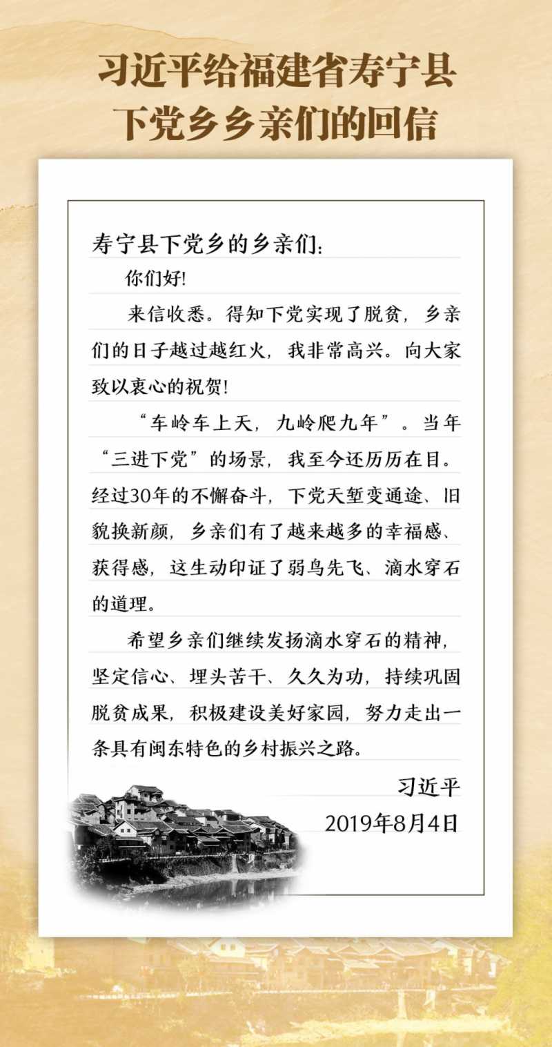 福建寿宁县下党乡,一个让习近平总书记深情牵挂的地方,在2020年新年贺词中再次被提及。“云南贡山独龙族群众、福建寿宁县下党乡的乡亲、‘王杰班’全体战士、北京体育大学研究生冠军班同学、澳门小朋友和义工老人,给我写了信。我在回信中肯定了大家取得的成绩,也表达了良好祝愿。”