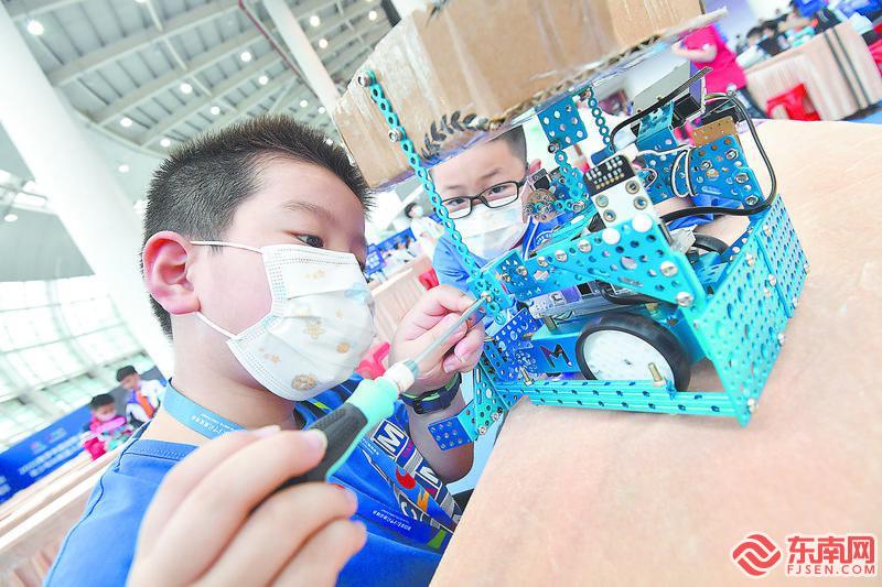 青少年AI机器人赛道参赛选手在做赛前准备。福建日报记者 林辉 摄
