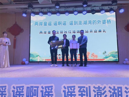 授牌仪式。主办方 供图 东南网12月31日讯(本网记者 卢金福)朗朗童谣声,悠悠两岸情。30日下午,“两岸童谣之旅”福瑞驿站启动仪式在福州三创中心举行,驿站将依托社区图书馆、社区家庭教育、师资等优势资源,举办童谣相关活动。 活动现场,两岸师生共同带来了童谣表演《逐梦》《时间都去哪儿了》《萌娃贺新春》和小提琴演奏《小星星变奏曲》等精彩的节目,赢得观众阵阵掌声。 福瑞青少年活动中心卓玮校长被聘任为驿站站长。他表示,童谣是童年的记忆、习俗的传承和游子的乡愁,也是闽台共同的文化纽带。驿站未来将举办“童真童趣”童谣创作交流等活动,让孩子们学习传唱两岸经典童谣,进一步培养两岸儿童对中华传统文化、民族语言与价值观的认同。 据了解,两岸童谣之旅活动由福州海峡两岸和平统一促进会发起,今年9月启动,将设立99个驿站,通过举办形式多样的两岸童谣文化活动,为两岸儿童提供更多的机会和平台,进一步促进两岸童谣文化的交流与融合。
