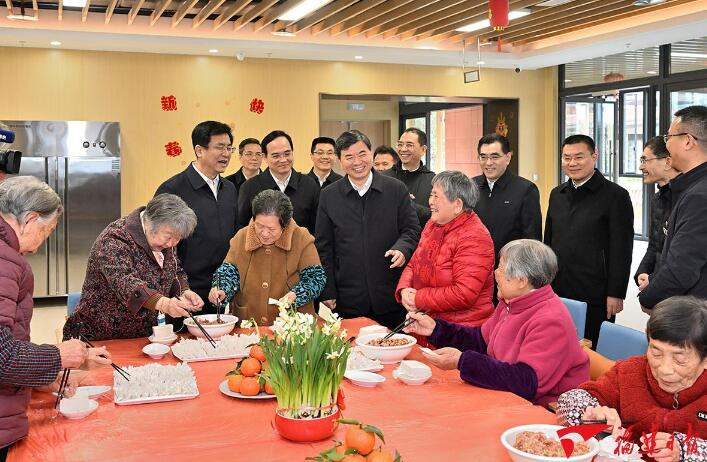时近中午,周祖翼、赵龙来到福州市社会福利院,与正在围桌包肉燕的老人家互动交流,一起重温习近平总书记去年春节前视频连线时的温馨场景;察看老人活动中心,了解福利院改造提升和春节期间文娱活动准备情况,看望福利院工作人员和社工。周祖翼说,你们的工作很辛苦也很光荣,要用无私的奉献给老人带去关爱和温暖。他还叮嘱当地负责同志,要以老年人幸福不幸福为标准,办好养老民生实事,大力发展公办养老机构和普惠型养老服务,完善社区居家养老服务网络,在完善硬件设施的同时进一步提升服务能力,不断丰富老年人精神文化生活,让老有所养、老有所医、老有所学、老有所为、老有所乐。