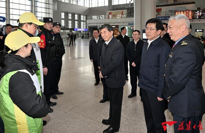 大年三十,福州火车站依然熙熙攘攘。周祖翼、赵龙走进候车大厅,察看旅客安检流程,了解旅客数量、客运组织、安全管理等情况,在王威服务台看望慰问车站工作人员、公安干警、志愿者,感谢大家坚守春运一线,用自己的辛勤工作护送万千旅客赴万家团圆。周祖翼希望大家要弘扬劳模精神,进一步增强服务意识,从旅客需求出发,不断完善车站各项设施,提供温馨周到服务,提升百姓出行舒适度和体验感;进一步提高安全意识,落细安全措施,加强秩序管理,排查安全隐患,完善应急预案,做好应急值班值守,全力以赴保障群众顺畅出行。