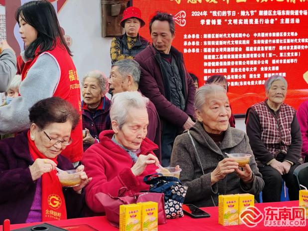 老人品尝甜美的拗九粥 东南网记者陈楠摄 东南网3月5日讯(本网记者 陈楠)三月的福州,处处充满温暖的味道。“一碗粥,温暖一座城”。在福州丁戊公园,身着红色马甲志愿者们将一碗碗热乎的拗九粥送到老人们手中,老人们笑着接下一碗粥,美美的吃上一口,感受节日带来的温暖…… “正月廿九复拗九,掼粥掼到家门口。”在朗朗上口的歌曲《拗九谣》中,表演志愿者们将拗九节的故事缓缓道来。“拗九糖粥飘香味,心满意足齐有味。每到拗九节,我们都为长辈们奉上亲手熬制的‘拗九粥’,表达我们的感激之情。”来自鼓楼区文明委、鼓楼区新时代文明实践中心、东街街道新时代文明实践所、东街街道竹林境社区新时代文明实践站的志愿者们为老人送上甜糯的热粥。 “我们一大早就忙碌起来,按照福州的传统做法,将红枣、桂圆、花生、糯米、马蹄碰撞在一起熬煮出来的拗九粥,充满着爱的甜蜜和幸福……”来自和谐苑的大厨们告诉记者。