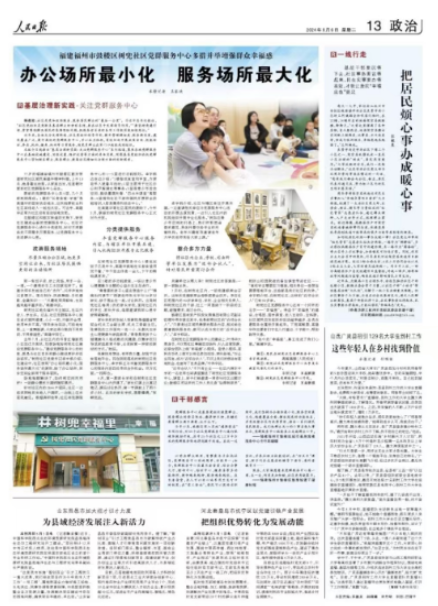 《人民日报》2024年8月6日13版 编者按:社区是党和政府联系、服务居民群众的“最后一公里”。习近平总书记指出,“社区党组织是党联系基层群众的神经末梢,要在社区中发挥领导作用。”“要坚持党建引领,紧紧围绕解决居民的急难愁盼问题,把服务老百姓的各项工作做深做细做到位。” 近年来,各地充分发挥街道、社区党组织领导作用,提升管理精细度、服务精准度,建设覆盖广泛、集约高效的党群服务中心,并以此为依托,有组织地开展政策咨询、技能培训、养老、托幼、健身、休闲等日常服务,使党员群众在家门口就能找到组织。 人民日报今日起推出“基层治理新实践·关注党群服务中心”系列报道,聚焦各地党群服务中心在基础设施建设、功能设置、维护运营等方面的具体实践,观察基层党组织依托党群服务中心密切联系群众、服务群众、提高社区精细化治理方面的创新探索。 77岁的福建省福州市鼓楼区鼓东街道树兜社区居民高建华精神抖擞,上午10点,她身着运动服,从家里出发,径直朝对面的社区党群服务中心走去。 眼前的党群服务中心共5层,几个月前刚刚落成。1楼的“长者食堂·学堂”是高建华的固定活动地点,这次她要赶去和社区其他老人一起包水饺。可去年,高建华还常为社区没有活动场地发愁。 在鼓楼区和鼓东街道的支持下,树兜社区建成全新的党群服务中心。社区对党群服务中心进行分类规划,针对不同群体的不同需求开展服务,让党群服务中心走进群众心里。 改善服务场地 尽量压缩办公区域,把更多空间让出来,为社区居民提供更好的活动场所 取一张饺子皮,添上肉馅,用手一合、一捏,一个漂亮的手工水饺就包好了。高建华用手托起自己的“杰作”,兴冲冲地向记者展示。面点制作、民族舞蹈、手机摄影、金融知识……“兴趣班周周都有,生活越来越丰富多彩。”高建华说。 树兜社区地处福州市主城区,社区内老人、学生多。过去,社区党群服务中心窝在老式居民楼里,小小一间,只够开会用,使用率并不高。“想来参加活动,可场地有限,上一堂舞蹈课,大家还得分散到不同房间、不同楼道里。”高建华回忆。 去年7月,以社区内的书香红墙新苑小区回迁为契机,划拨场地给树兜社区建设党群服务中心。“建设党群服务中心的初衷,就是为社区党员和群众提供更好的活动场所。”树兜社区党委书记卓宇枫介绍,在建设中,社区按照“办公场所最小化,服务场所最大化”的原则,除了办公场所,其余空间全部用于服务居民。 场地难题解决了,如何把空间利用好?一场群众需求大调研随即展开。 针对社区内的2844户居民,社区一边组织网格员实地入户调研,一边线上征求居民意见。根据调研结果,社区将党群服务中心的1—5层进行功能规划。卓宇枫边走边介绍:“1楼做成食堂和学堂,方便老年人就餐与活动;2层主要用于社区办公和矛盾调处等事务;3层是青少年活动空间,提供暑期托管、‘四点半课堂’等服务;4层面向社区干部和居民开展职业技能培训,5层是健身和活动中心。” 在高建华等社区居民的期盼下,今年3月,崭新的树兜社区党群服务中心正式对外开放。 分类提供服务 丰富党群服务中心服务内容,与辖区单位开展共建,引入机构组织开展专业化服务 在树兜社区党群服务中心1楼包完饺子已是中午,高建华就地在长者食堂用完午餐,“中午回去休息一会儿,下午的剪纸课再来。” 在3楼的多功能教室,一场以青少年心理健康为主题的公益沙龙正在进行。 “青春期的孩子心里在想些什么?”“情绪如何调节?”授课老师张光华与30多对家长、孩子围坐在一起,讨论热烈。这是树兜社区每周1次的家长学校,面向社区内的学生、家长开设,每期邀请资深心理专家释疑解惑。 家长学校的发起人张琳悦是福建省贸促会机关工会副主席、机关工委副主任。张琳悦的工作面向一老一小,长期关注学生心理健康与家庭教育。“青春期是孩子心理健康与人格成熟的关键期,仅靠学校引导或家庭教育不够,必须探索一种家校联动的方式。”她说。 张琳悦有想法、有师资力量,却苦于没有落地平台。而在刚刚落成的树兜社区党群服务中心,卓宇枫正为丰富党群服务中心的服务内容四处寻找合作机会。双方见面,一拍即合。 4月,第一期家长学校在树兜社区党群服务中心内开课了。“家长们课上认真记笔记,课后讨论热烈,第一节课就上了两个多小时。此后的家长学校,期期爆满。”张琳悦说。 卓宇枫介绍,社区与辖区单位开展共建,一边邀请相关单位为党群服务中心活动的开展出谋划策,一边引入社区内的机构组织开展专业化服务。“例如在青少年空间的打造上,我们听取团省委的意见,具体托管交给专业的托管机构。老年兴趣班则邀请老年大学的老师来给大家上课。” 整合多方力量 将社区内企业、学校、司法所等单位发展为“近邻合伙人”,针对居民所需商讨合作 共建单位从哪儿来?树兜社区的答案是:一家一家跑出来。 7月初,在树兜社区内,一场党建联席会召开。这样的党建联席会每季度都会召开。来自社区范围内的40多家单位、学校、企业相关负责人,和树兜社区的干部、社工一同围绕下一阶段的主题,碰撞需求、商讨合作。 鼓楼区国有资产投资发展集团有限公司副总经理叶伟华就在其中,他是树兜社区的“近邻合伙人”。“只要是社区居民需要的服务内容