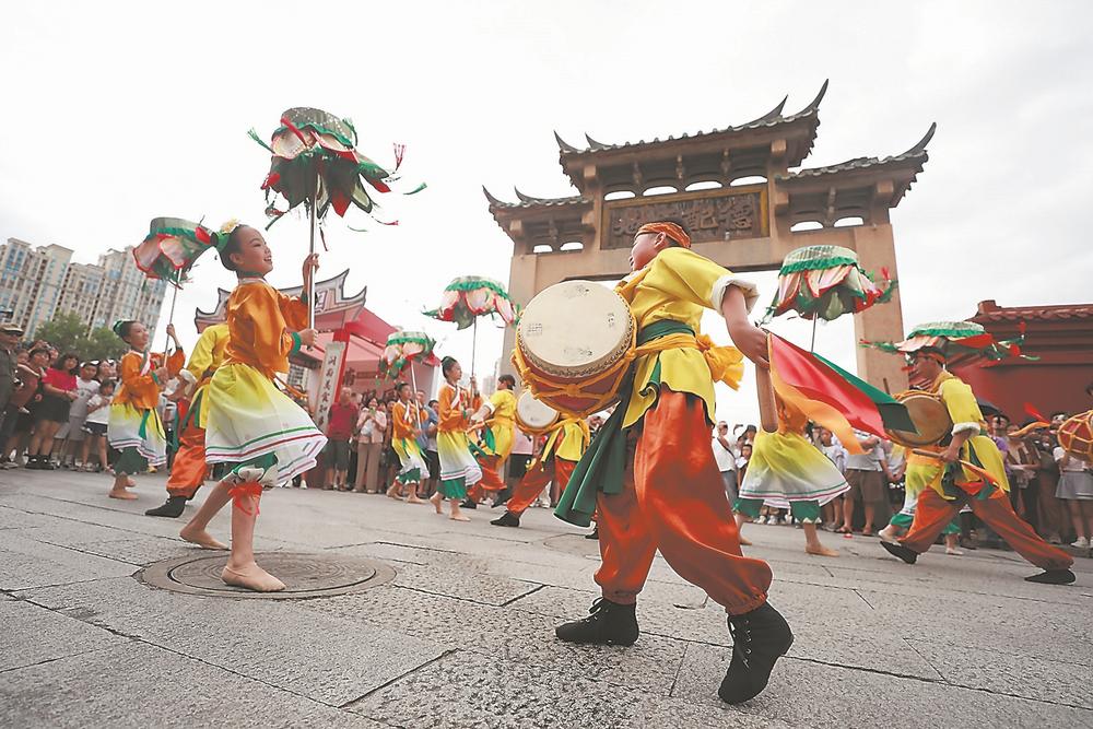 大鼓凉伞舞是漳州传统民间舞蹈,起源于明嘉靖年间,是戚继光的部队在胜利后所跳的一种群舞,以场面壮观、气势恢宏著称。 福建日报记者 萧镇平通讯员 郑文典 刘钦赐 摄
