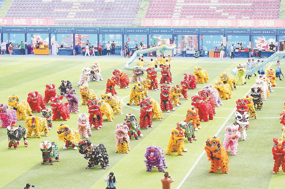 1日,“非遗在线 漳平之恋”中国·漳平市首届非遗展览会开幕。展览会为期4天,共设置了100个展位,涵盖民间表演艺术、传统习俗、手工艺技能等多个方面。图为开幕式上的醒狮表演。福建日报记者 罗小春 通讯员 陈惠 吴卉 摄