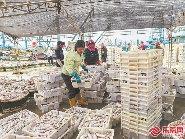 1日,石狮祥芝国家中心渔港,渔船满载而归。一筐筐的新鲜渔获被吊运上码头,准备销往市场。图为商贩搬运选好的海鲜。福建日报记者 王毅 摄