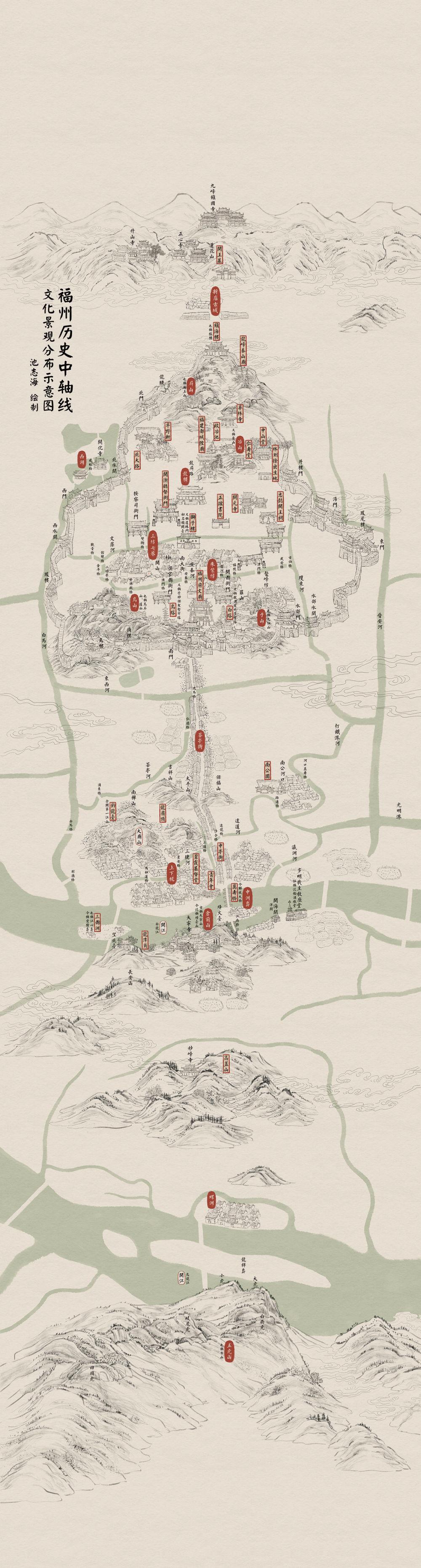 福州市规划馆有一幅清康熙年间《福州城图》的拓本:一条北起屏山、南抵烟台山的中轴线清晰可辨。虽不像北京城中轴线那般威严规整,却多了几分“城在山水中、山水在城中”的灵秀。