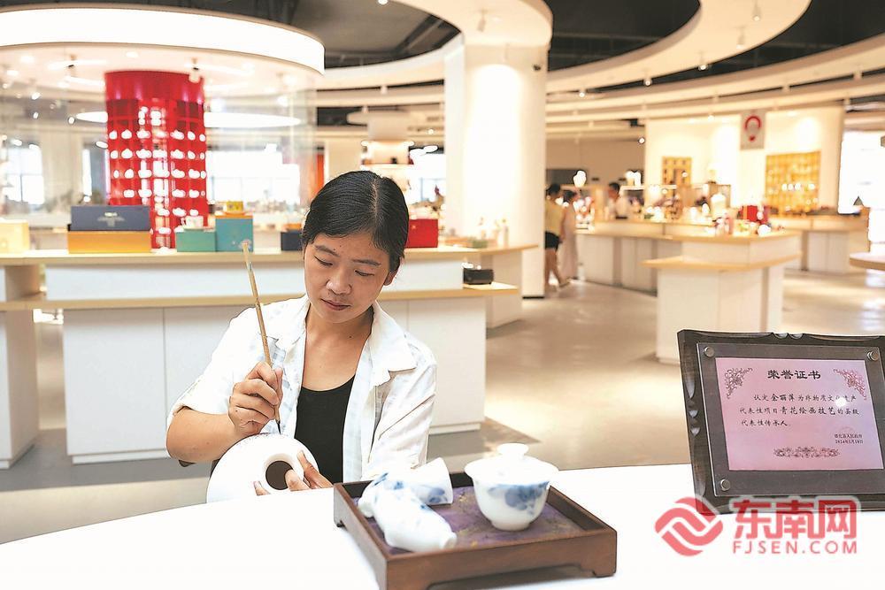 德化非遗代表性项目青花绘画技艺县级传承人余丽萍在为参观者展示青花绘画。福建日报记者 王毅 摄