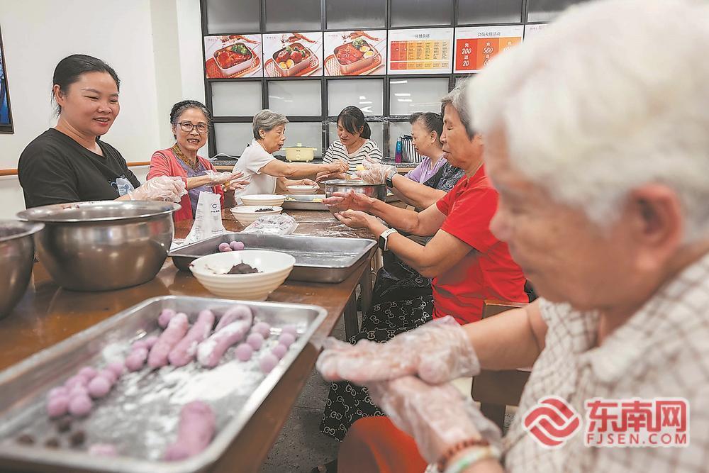 厦门市思明区开元街道养老服务照料中心,老人和工作人员一起包汤圆。福建日报记者 王毅 摄