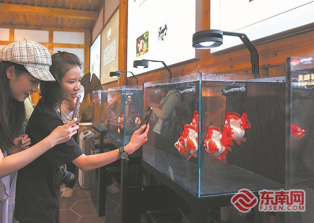 闽侯县金鱼产业龙头企业潘氏观赏鱼养殖场内,游客在金鱼文化特色展馆观赏金鱼。福建日报记者施辰静 摄