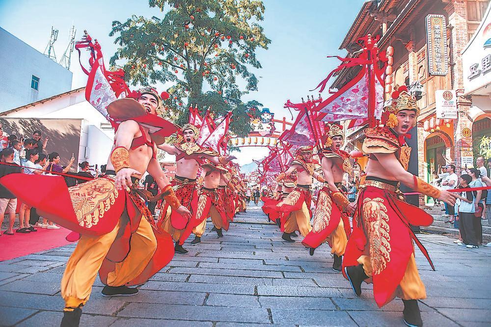 国庆中秋假期,永春五里古街的宋江阵表演吸引游客驻足观看。此次宋江阵表演中融入蟳埔簪花围民俗元素,还加入高甲戏打斗、青狮吐火等绝技,让千年古街与鲜活的非遗交织碰撞。福建日报记者 何金 通讯员 苏福彬 陈志鹏 摄