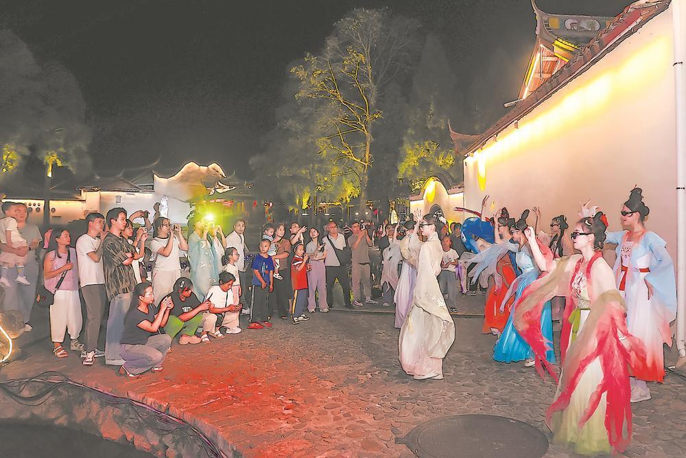 国庆中秋假期,在周宁县鲤鱼溪景区,身着汉服的演员翩然起舞,国潮风十足的表演引得游客拍照打卡。
