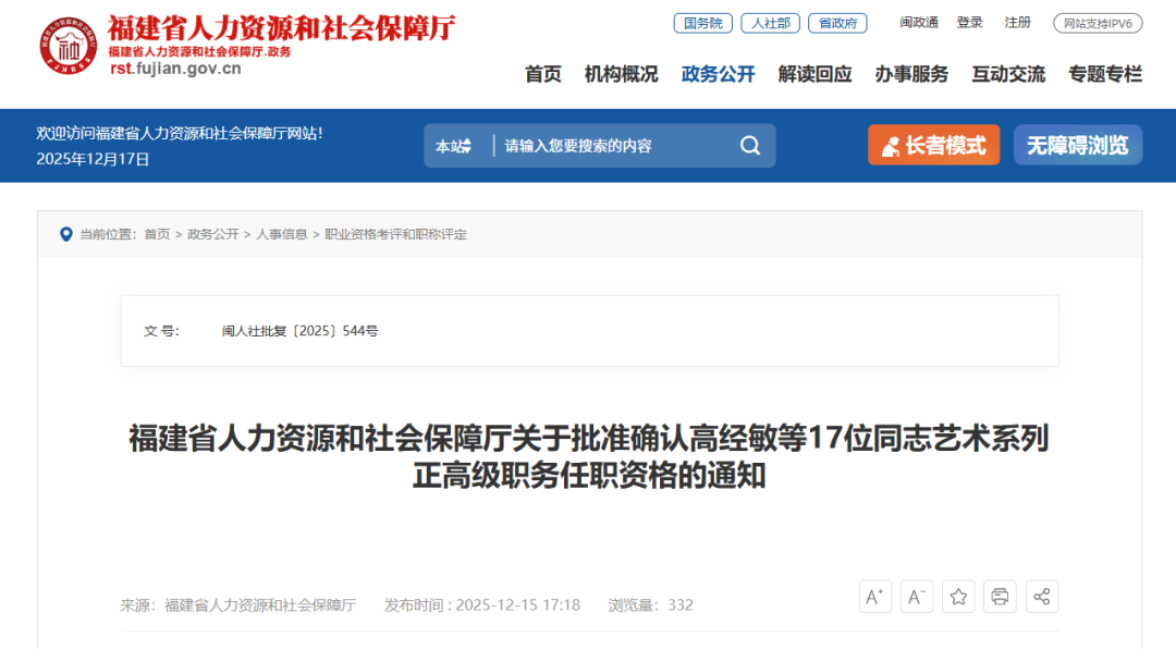 近日 福建省人社厅发布通知 批准确认了一批 获评高级职称人员名单 共17人 一起来看—— 关于批准确认高经敏等17位同志 艺术系列正高级职务任职资格的通知