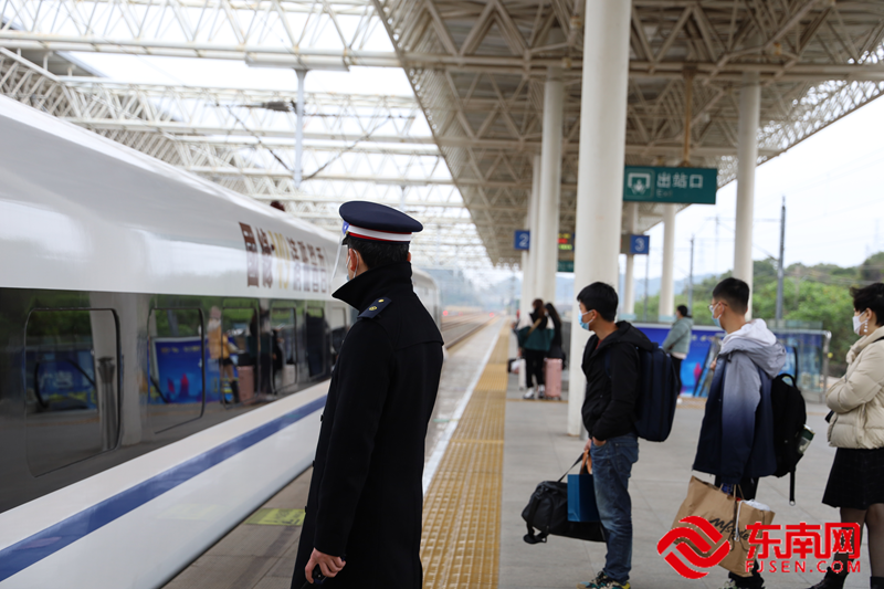 站台工作人员指挥旅客安全上车(东南网福清频道见习记者 吴韵童 摄)