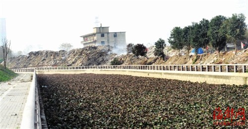 内河驳岸整修一新,但河内长满水草,沿岸堆着如山的垃圾