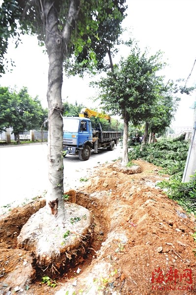 树根已经被挖空,马上要被运走 东南网-海峡都市报2月25日讯(记者 侯希辰 毛朝青 实习生 张炳琼 文/图)“有人在挖行道树。”昨天中午,有读者向本报新闻热线报料说,在福州仓山区盖山投资区高旺路见到这样一幕。 记者赶到现场,看到路一侧的行道树,有的只剩下树坑,有的已经被连根挖起,还有一台吊车正在起吊树木装车。“这些榕树都种了好多年了,难道有人在偷挖?”在现场,记者找到了几名施工工人,他们表示这里是进行更换行道树树种,“是盖山镇镇政府布置的,将改种成更漂亮的樟树,而榕树要移种到别的地方去。” |
