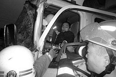 南港大桥头两车相撞 凹陷车头紧“咬”司机腿