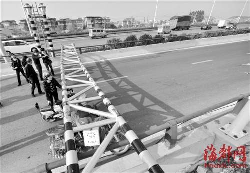 限高架被撞倒了,成了“路障”,挡住机动车,骑手们也只能下车,弯腰推车钻过去 东南网-海峡都市报3月13日讯(记者 薛辉 毛朝青 实习生 黄冬梅 文/图)昨日下午2时20分左右,福州螺洲大桥桥口的限高架,被两辆车先后撞击后,横梁脱落,所幸没有砸中往来车辆。这个限高架,三天前刚刚立起(详见本报3月12日A12版),今天就被撞翻。据悉,昨日下午5时30分起,该限高架将从4米降低为3.8米。(相关新闻:福州螺洲大桥四根钢梁突然倒下 超高车被砸中) 昨日下午,记者在现场看到,限高架横梁被撞落,横搭在桥两边的护栏上,七八部车子排成队堵在桥口处。现场的保安告诉记者,下午2点20分左右,有两辆超高货车前后通过,“两辆车都擦着限高架,强行通过,横梁被撞到,晃了一下,就砸了下来,所幸并未砸中路过的车辆。” 施工方中铁八局的工作人员告诉记者,这个限高架原本一直都有,但半个月被撞倒了三次,3月10日,他们重新立起了限高架,没想到马上就被撞翻了。“我们已经安排了保安值守,但是仍有不少超高车硬闯。” 撞倒限高架的货车司机告诉记者,同样是这部车,以前是能够通过的,这次撞到横梁,是因为限高架高度降低了。 中铁八局工作人员告诉记者,此前,限高架一直标注为4米,但预留了一些空间,实际上是4.2米,10日重装时,将实际高度调整为4.05米。 据了解,限高架又被撞翻后,高度将再次降低至3.8米。工作人员告诉记者,两公里外的环岛路互通桥限高4米,目前正在施工,为了防止超高车“伤害”桥梁,因此设置了限高架。 |