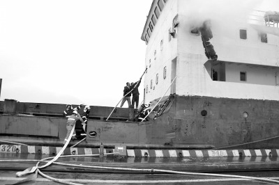 货轮靠岸时船舱起火 3楼员工打碎窗跳下灭火