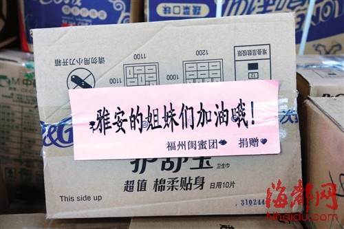 爱心物资上还贴有鼓励的话语 24日23时,已是深夜,青口顺丰快递福州区中转场依然一片忙碌。老家在成都的分拣员小吴,在传送带旁埋头分拣着送往雅安的赈灾物资,这已经是他们连续三天的义务加班。小吴说,他家离雅安只有200公里,他知道大地震意味着什么,他们现在能做的就是尽量将这些物资分拣完,送往雅安,越快越好。 |