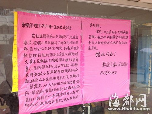 物业贴告示欲收取停车费 业主质疑程序不对