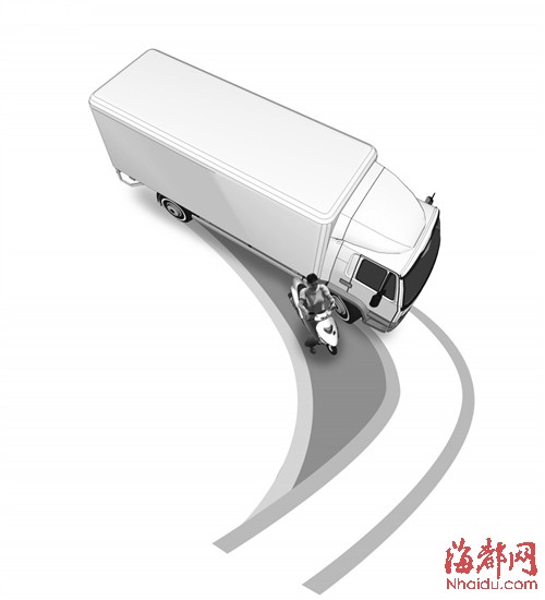 离拐弯大货车远点 前晚,福州铜盘路口,一辆电动车险些被卷入车底;警方称,货车路口拐弯时,司机会出现“视觉盲区”