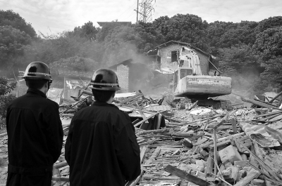 马坑山违法建筑开始拆除,执法人员在场监督 见习记者翟星理/文陈腾健/图 昨日上午8点,福州鼓楼区洪山镇政府协同市、区国土局及区市容管理局,联合出动数百名执法人员和拆违机械,开始对梅峰经合社马坑山集体山林地违法建筑进行集中拆除。 据了解,执法人员6个月前就开始对马坑山的违建情况进行摸底调查,查明该片区存在违法建设75处,共计房屋199间,总面积约1万平方米。 A 拆违现场砖缝间砂浆一抠就掉 昨日上午8点,执法人员对洪山镇梅峰经合社马坑山集体山林地上的违法建筑开始拆除。 这些违法建筑比较简陋,墙体未经粉刷,由黄砖砌成,房屋顶部仅有石棉瓦遮盖。一位执法人员介绍,这些房屋多属于危房,建筑质量堪忧。 在一间即将拆除的房屋外,这位执法人员把一根手指伸进墙面上两块砖头的缝隙处,一用力,缝隙处的砂浆就掉下一大块。“这种砂浆,里面根本没有水泥,水一泡就塌。”该执法人员说。 至上午9点半,约1000平方米的违法建筑已被拆除。 据洪山镇政府一位工作人员介绍,马坑山集体山林地上所有的违法建筑预计今天可以全部拆除。之后,洪山镇政府将联系市园林部门,“先补植山地上的植被,预计会在这里建一个公园。”该工作人员说。 |